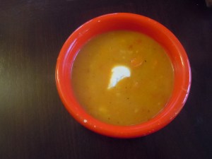 I had a lovely bowl of leftover roasted squash recently. Soup time! A chopped onion, a few chopped carrots, a clove of garlic and a minced Fresno chile went into a stockpot, to be sautéed in a little oil. (Did I mention that I’m currently addicted to Fresnos? I put them in everything these days, but here I really thought their sweet perfumy heat would blend well with the squash and carrots.) I tossed in a cubed potato and covered it all with chicken stock. Once the veg were tender, the leftover squash joined the party. A brisk whir with the stick blender, a dollop of Greek yogurt, and voilá — sunset-colored, sweet-spicy soup in half an hour.