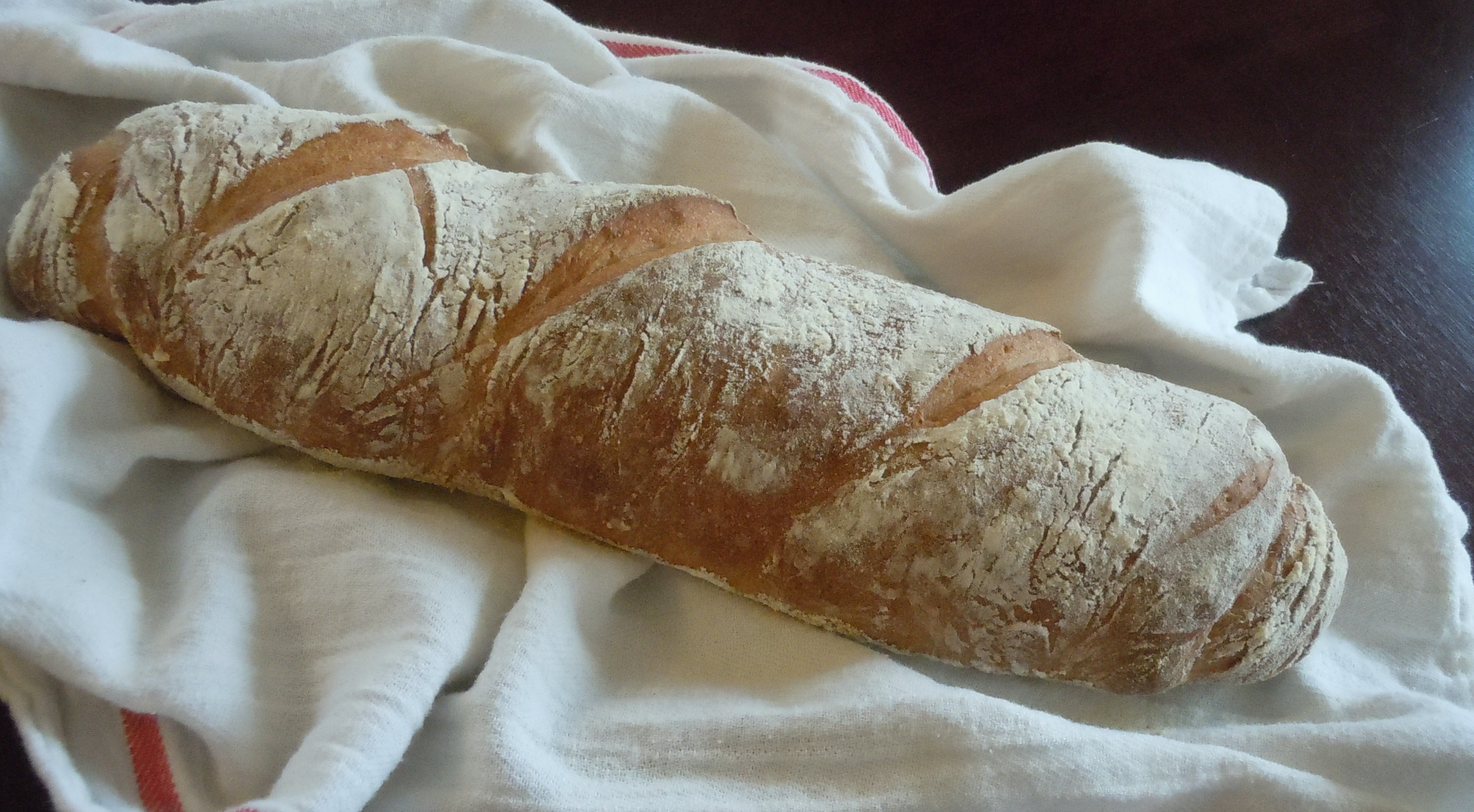 Line a cookie sheet with parchment, then sprinkle liberally with cornmeal; set aside. Dust the counter with flour. Punch the dough down and turn out onto the floured counter. Pat into a fairly thin rectangle (mine was about 11 x 14 inches). Roll into a fat log. Transfer the log to the cookie sheet. Dust it liberally with flour, cover with a damp towel again, and set in a warm place to rise. (I let mine rise for just over an hour and a half, and it could have used another 30 minutes on this cold, damp day.)