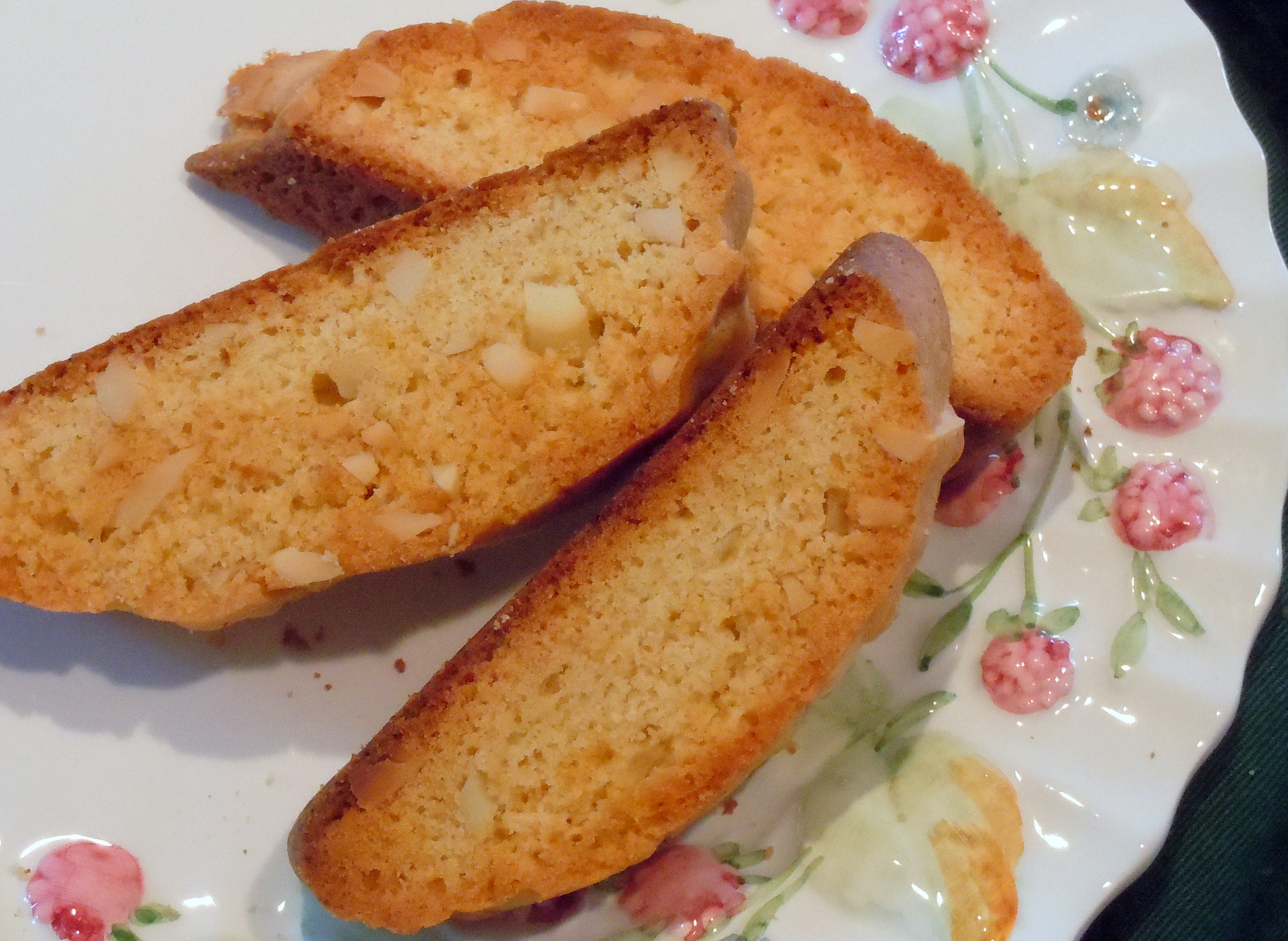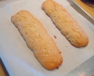 “Biscotti” means “twice-cooked.” The biscotti are cooked first in long logs, then sliced into individual cookies and baked again.