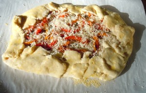 Spread the ricotta over the dough to within about an inch and a half of the edge. Sprinkle with the herbs, if you’re adding them, and with ¼ cup of the parmesan. Arrange the veg in a pretty pattern if you’re so inclined, or just pile them on if you’re not. Sprinkle the veg with the remaining parm. Fold the edges of the dough toward the center; a good portion of the filling should be still visible. This is not the time for perfection; a galette is supposed to be rustic and freeform.