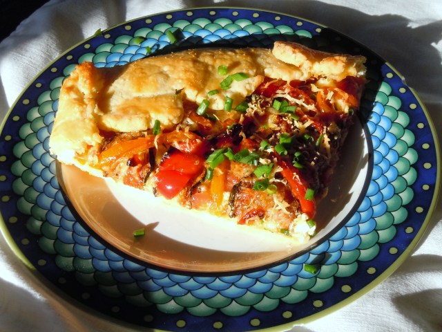 I’ve been reading about those free-form tarts called galettes lately. I went through a galette phase years ago, but hadn’t made one recently. The rustic aspect is appealing, as is the complete freedom to fill them with anything the imagination — and the pantry — can come up with. It’s also one of the few crusts I’ve been able to make that doesn’t end up tasting like cardboard (need to work on that; I clearly did not inherit my mom’s piecrust-making genes).