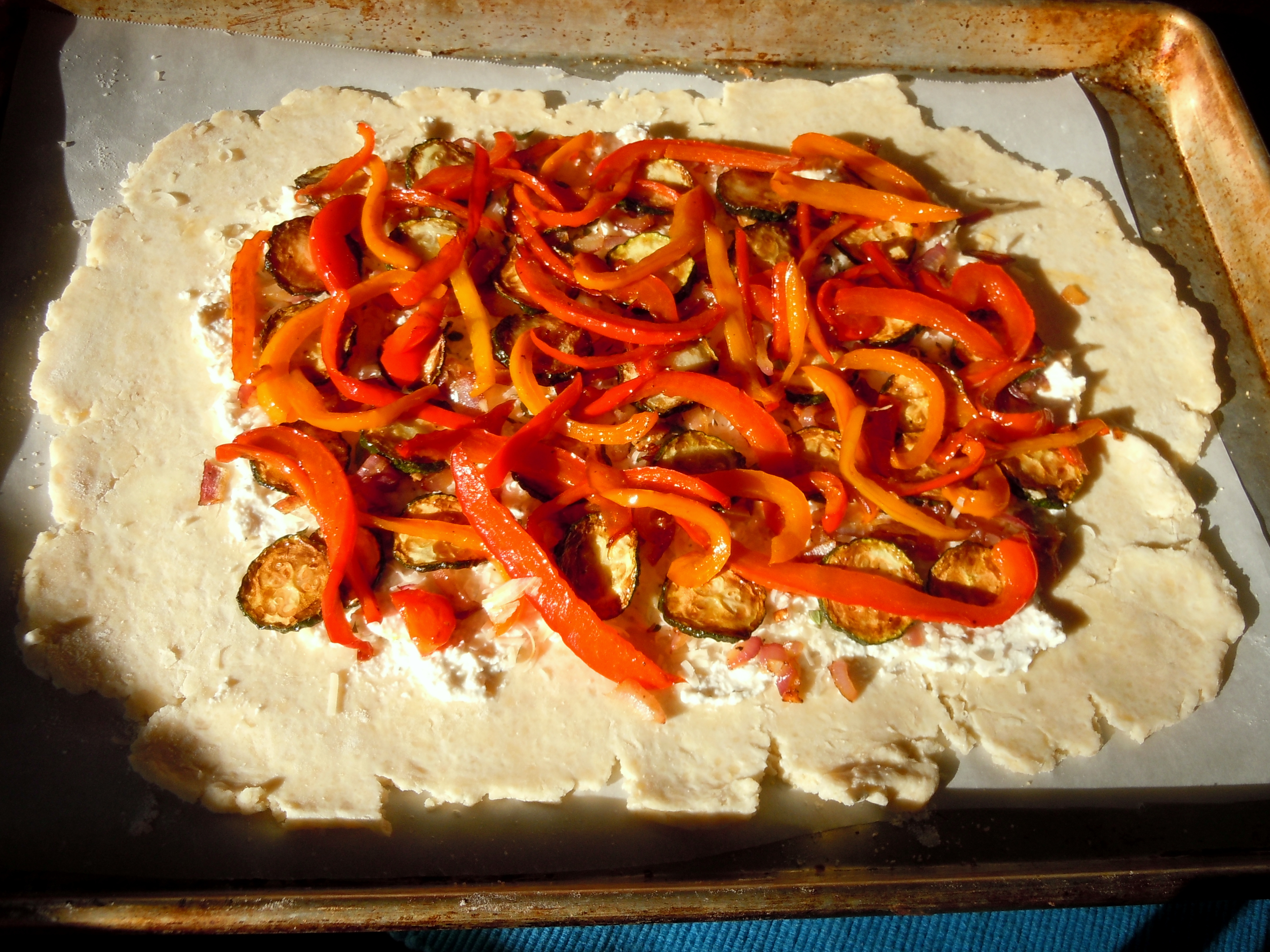 The filling is comprised of what was in the house: a cup of my latest attempt at homemade ricotta, some sour cream (for the ricotta — tasty but still too dry), one lone zucchini and a few bell peppers. I’ve also made sweet galettes with pears or peaches before; this is one very flexible concept. If you do go the sweet route, sprinkle the crust of the finished galette with a little sugar just before popping it in the oven.