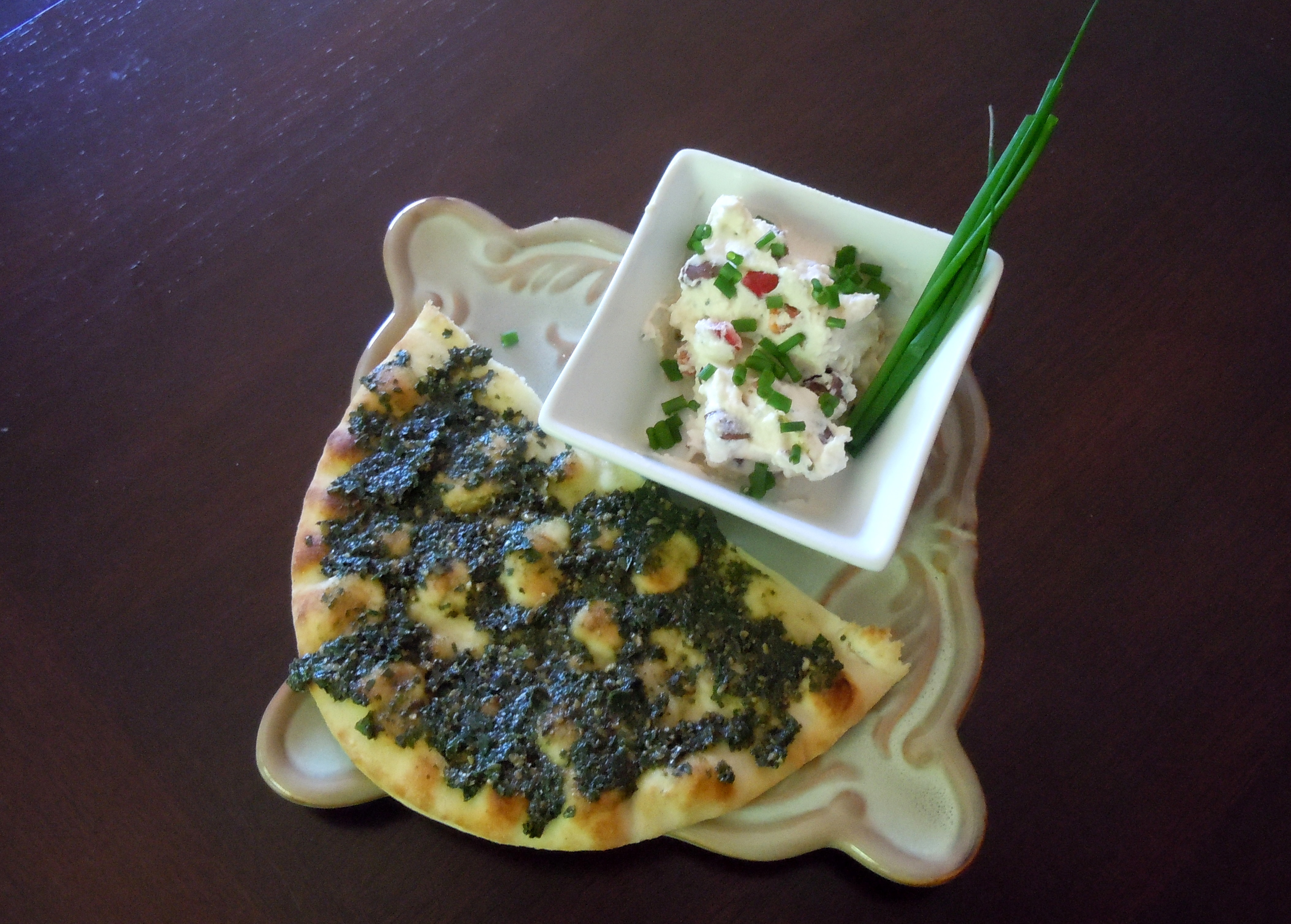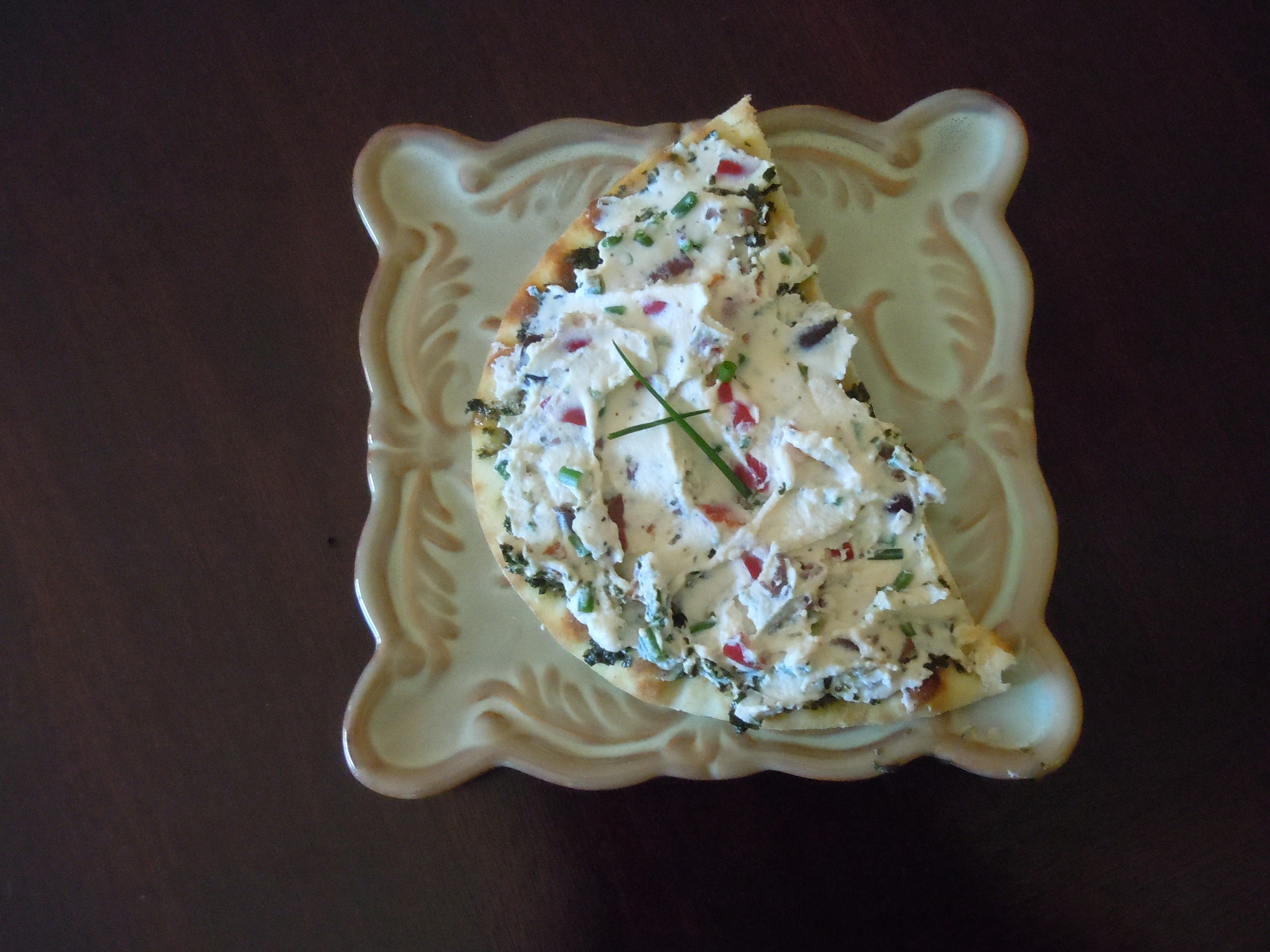 For some color and crunch, I added a bit of minced red pepper and chives to the ricotta; for salt, chopped calamata olives. I spread a thin layer of pesto on some naan (Indian flatbread), then topped it with the creamy ricotta. The herbs and garlic in the pesto added just the right complexity to the mild, creamy ricotta. This combo will also be yummy on crisp toasted slices of baguette, on bagels instead of cream cheese, or stuffed into cherry tomatoes.