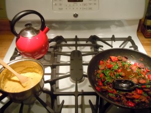 Polenta sets up very quickly once it’s cooked, so make sure the stew is ready before the polenta is. If you have a good kitchen helper in your house, the helper can cook the polenta while you make the stew; they take about the same amount of time.