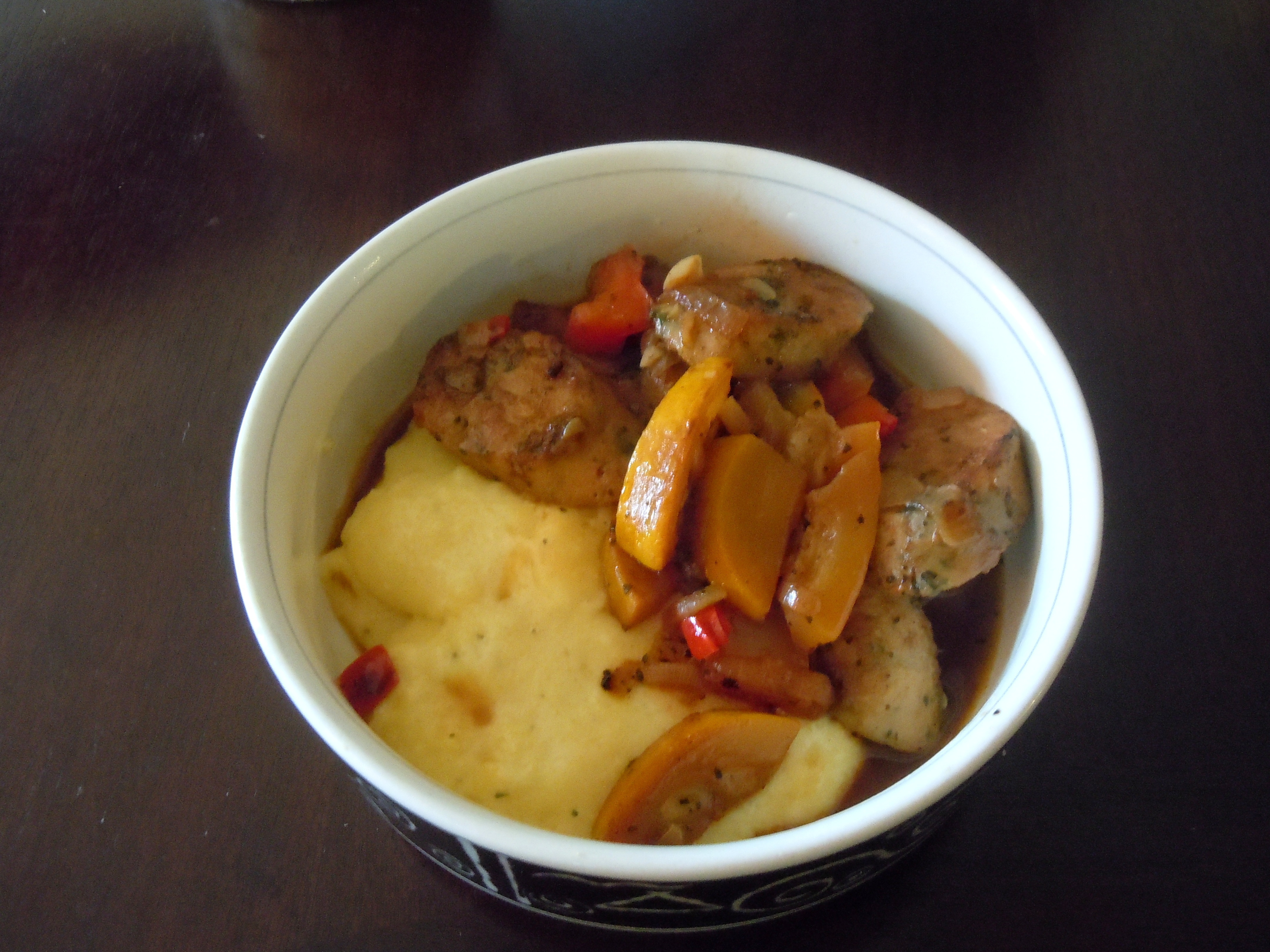 I came home with an orange bell pepper, a handful of those unnamed chiles, and some deep yellow summer squash. With the chicken sausage I had in the fridge, they’d make a nice stew to serve over polenta.