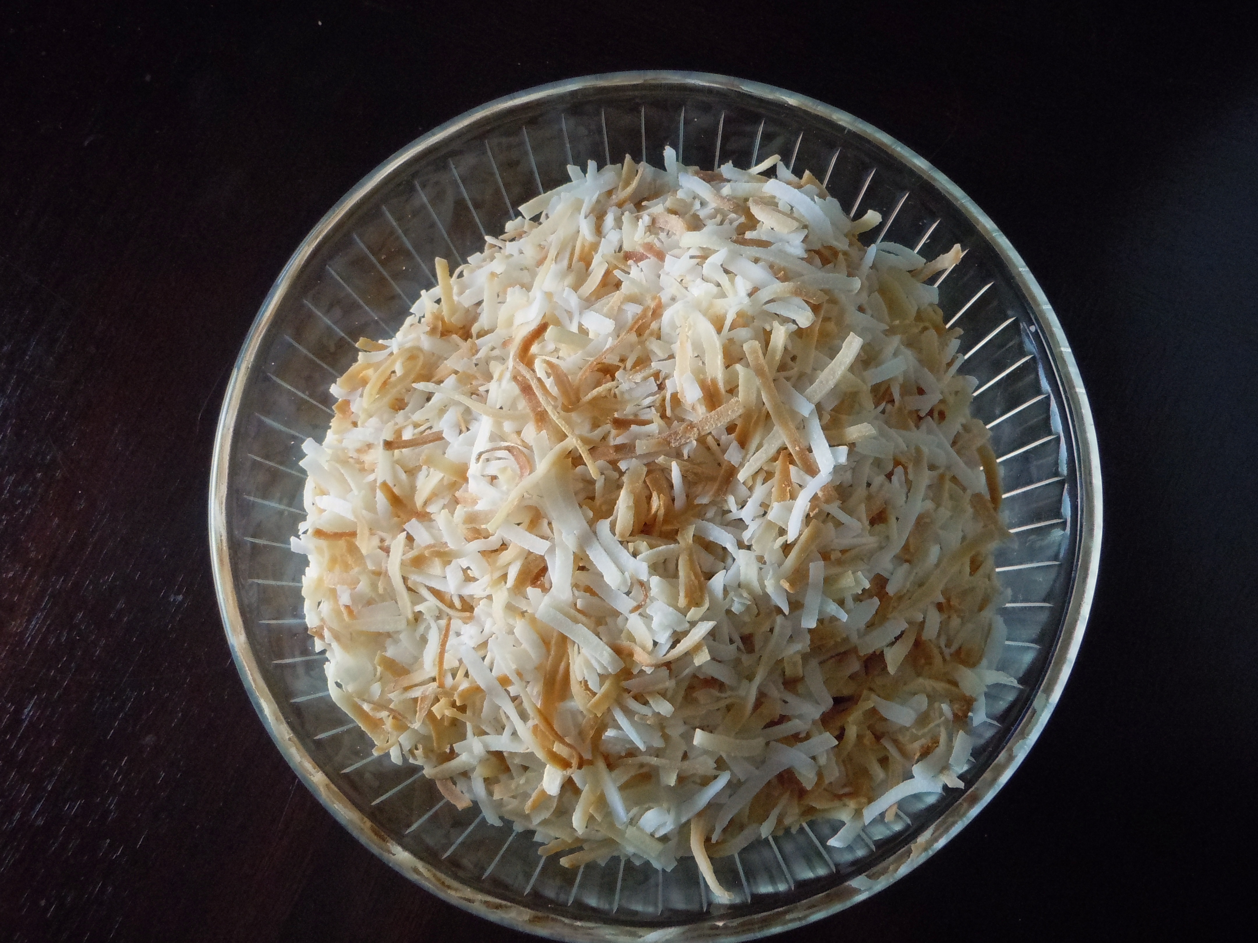 Alton toasts the coconut, which really develops the flavor. I spread mine on a small baking tray and set my toaster oven at 350 degrees F. You can do it in the regular oven or even in a skillet on the stove over medium-low heat. Just as when toasting nuts, you need to keep an eye on things, since the coconut can go from toasty to burned in a surprisingly short amount of time.