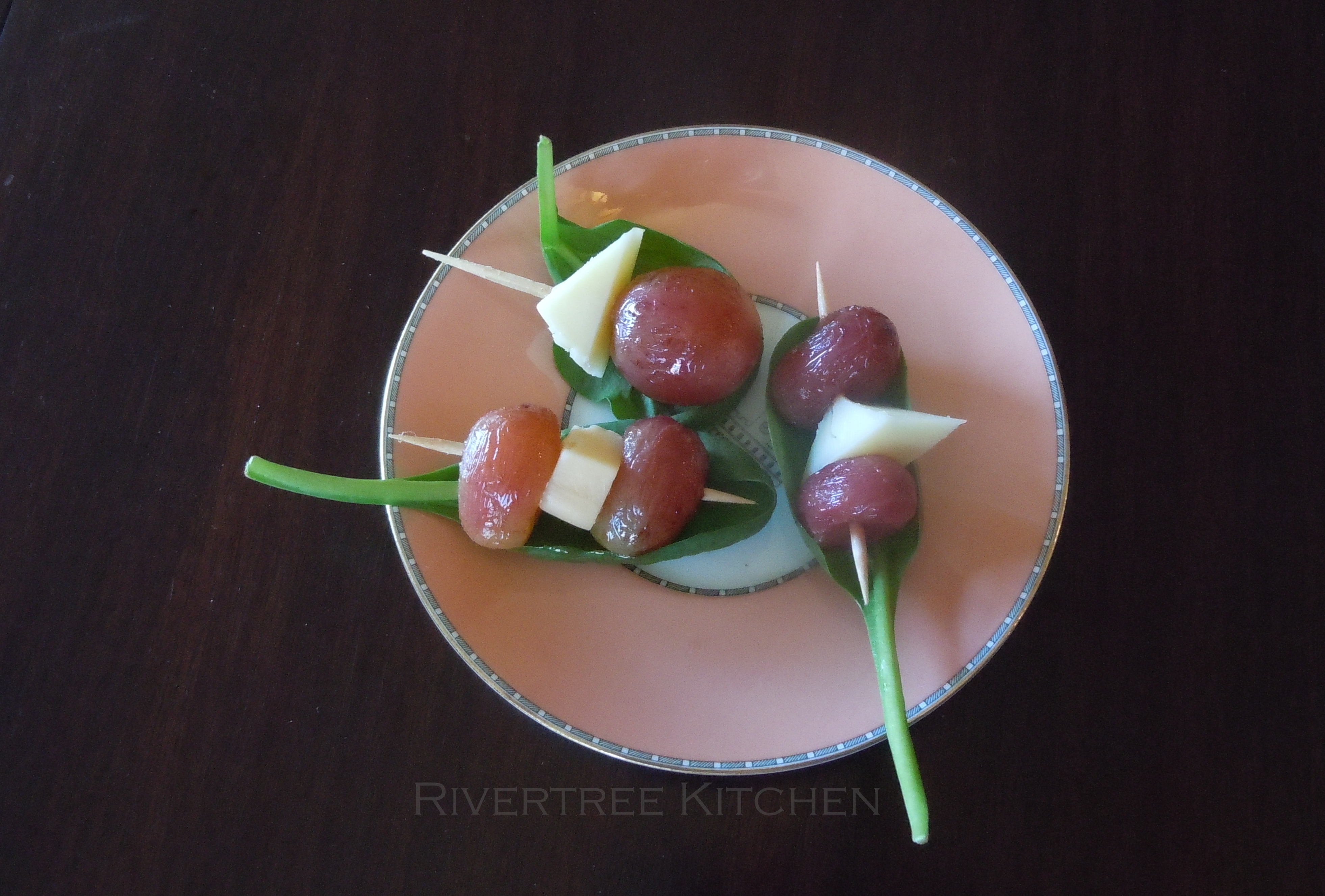 They’re also great as a surprising appetizer: one large or two small grapes skewered with a morsel of cheese. I used a Wisconsin Abergele, which is buttery soft with a hint of tang. I have yet to figure out how to make the skewers look pretty; I apologize for that. But the taste is a wine and cheese party on a stick. It gave me thoughts of a smear of gorgonzola on a toasted baguette slice, topped with a few halved roasted grapes. Or maybe a bit of sharp cheddar nestled in a tiny phyllo cup and topped with a roasted grape.