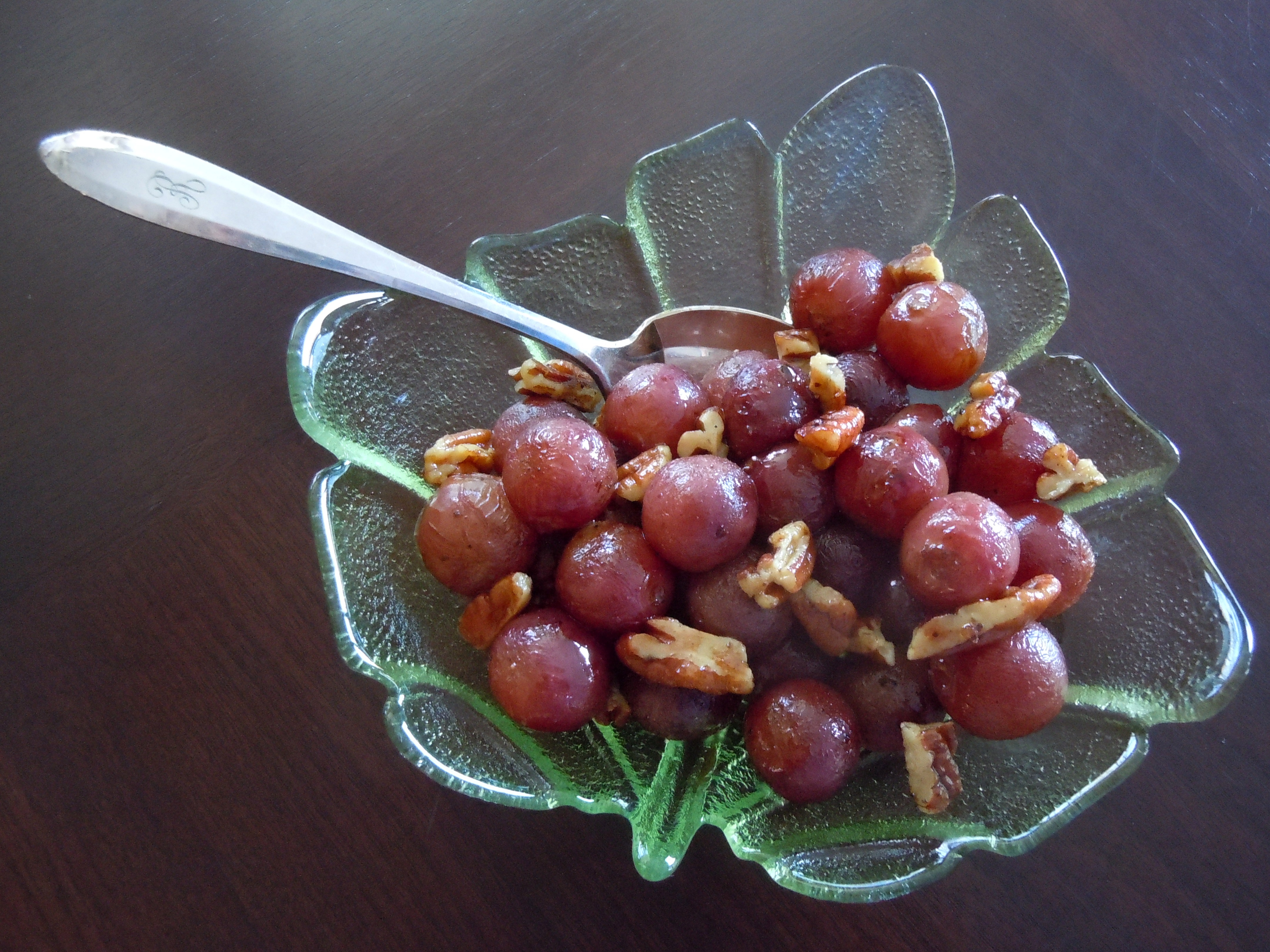 I served the grapes as a side dish with braised chicken thighs; they’d also be delicious with ham or pork. I’ve actually eaten a bowl of them for lunch, simply accompanied by a wedge of good cheese and a few crackers.