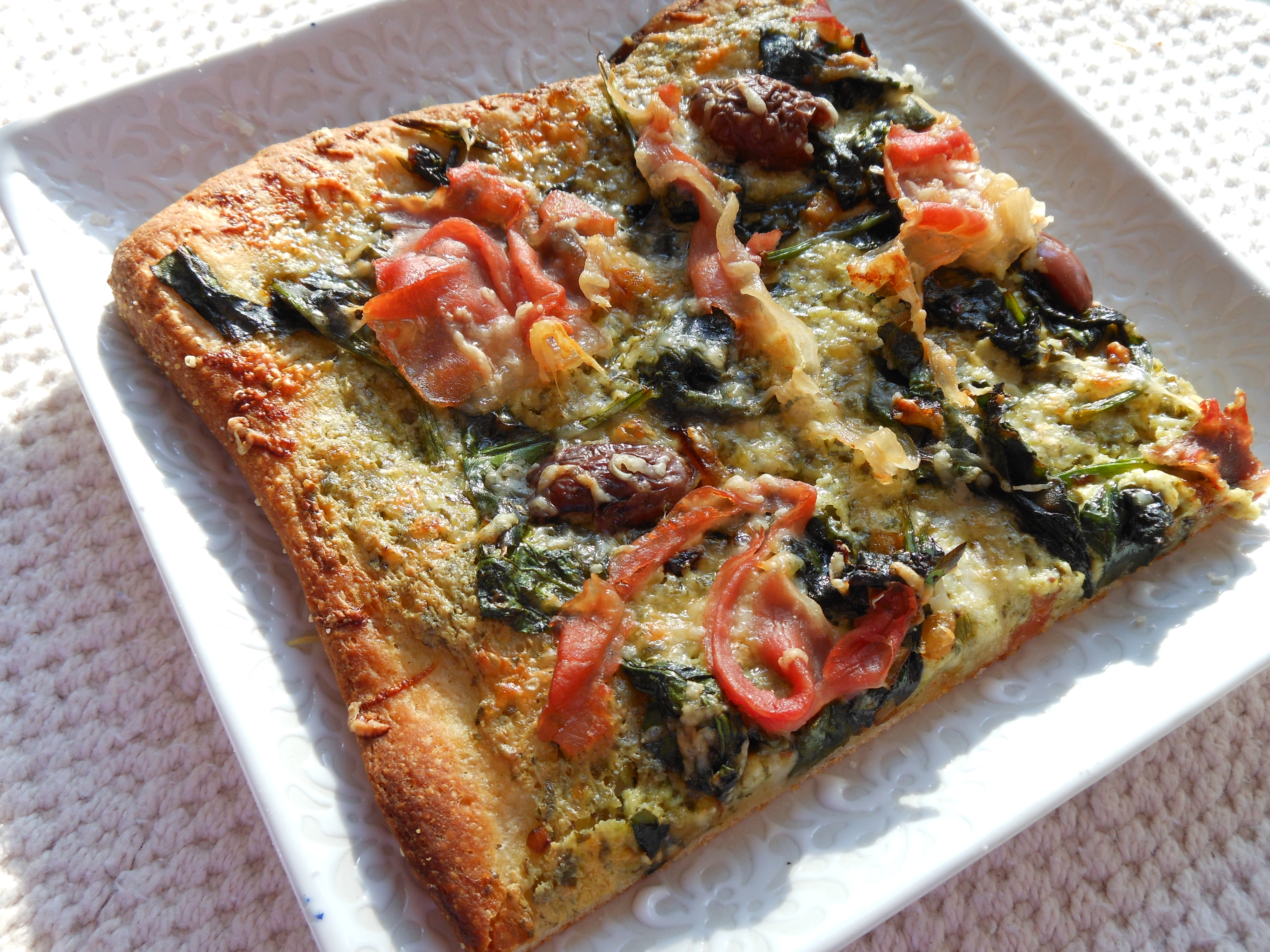Mix the ricotta and pesto in a small bowl. Spread the ricotta mixture evenly over the dough. Distribute the spinach over the ricotta, then top with the olives. Sprinkle with parmesan. Pull the prosciutto into shreds and drape on the top. Bake for about 15 minutes, until the edges of the crust are golden and the prosciutto is crisp.