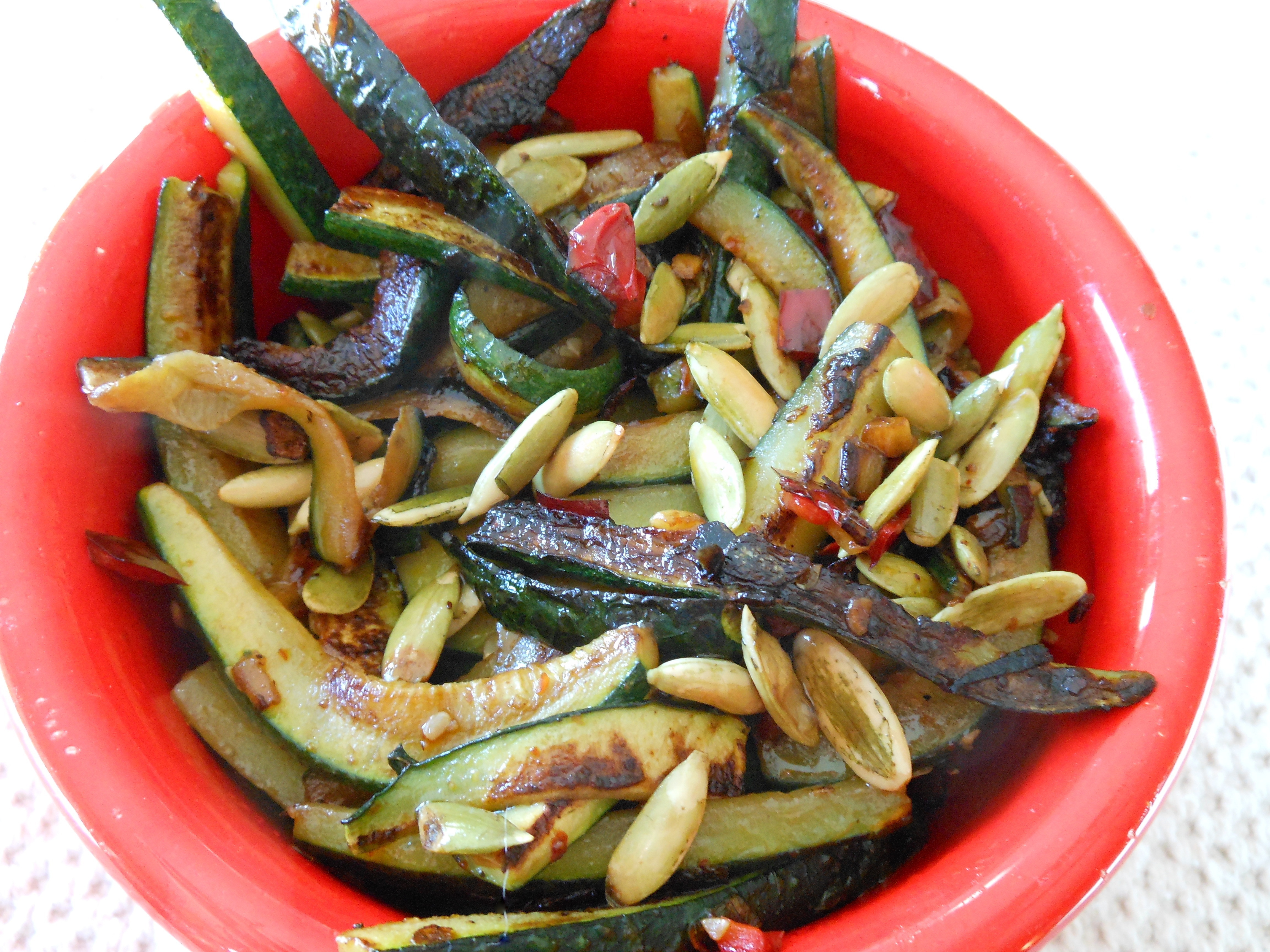 You could slice or rough-chop the zucchini (and I do sometimes), but I like how the stiff squash batons soften and curl around each other. The lovely green pepitas* provide a crunchy contrast. As usual, I couldn’t resist adding a minced Fresno chile; the red flecks are so pretty against the green.