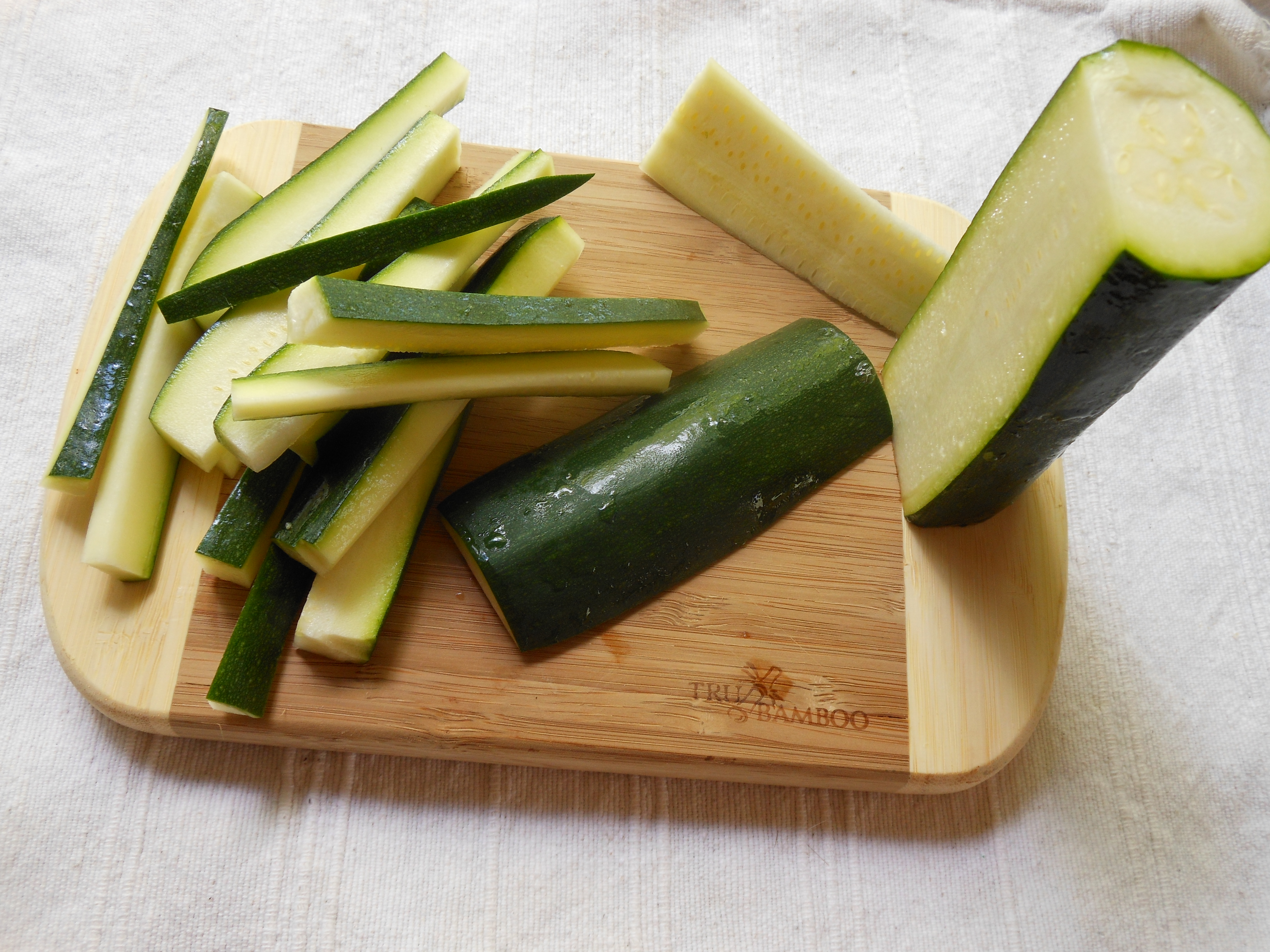 Trim the ends off the zucchini. Stand one zucchini on an end and slice vertically. You’re aiming for a long piece with all the skin and roughly an inch or less of flesh. Continue slicing around the zucchini until you have long, thin strips and there’s a seedy core left over. Discard the core and slice the rest into 1/2-inch thick sticks 3 to 4 inches long. (This is a great way to use those baseball-bat-sized zucchini.) Or you can just slice them into rounds, if the sticks are too fussy for you.