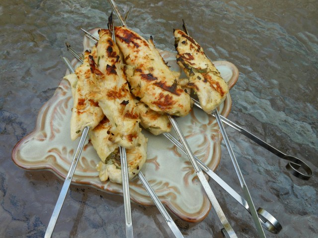 Fire up the grill. Pull the chicken pieces out of the marinade (no need to wipe off) and grill until golden and cooked through. I used boneless, skinless chicken breast tenders which I skewered; they took about 4 minutes on each side on a hot grill. We’ve also done this with boneless, skinless breasts pounded thin, which take about the same amount of time. Serve with the scallion cream.