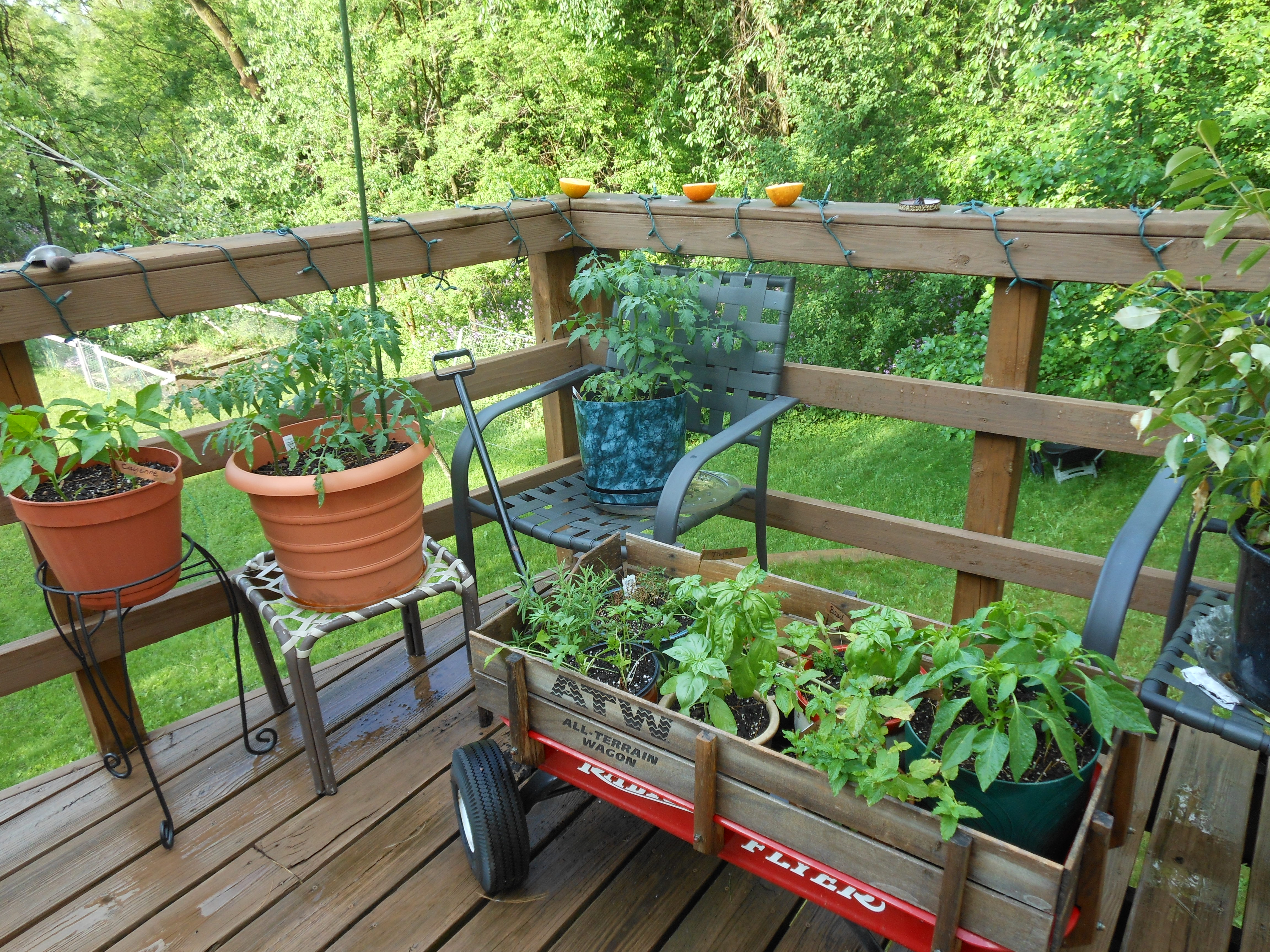 Herbs, tomatoes, and peppers on the deck. The oranges on the railing are to feed the orioles.
