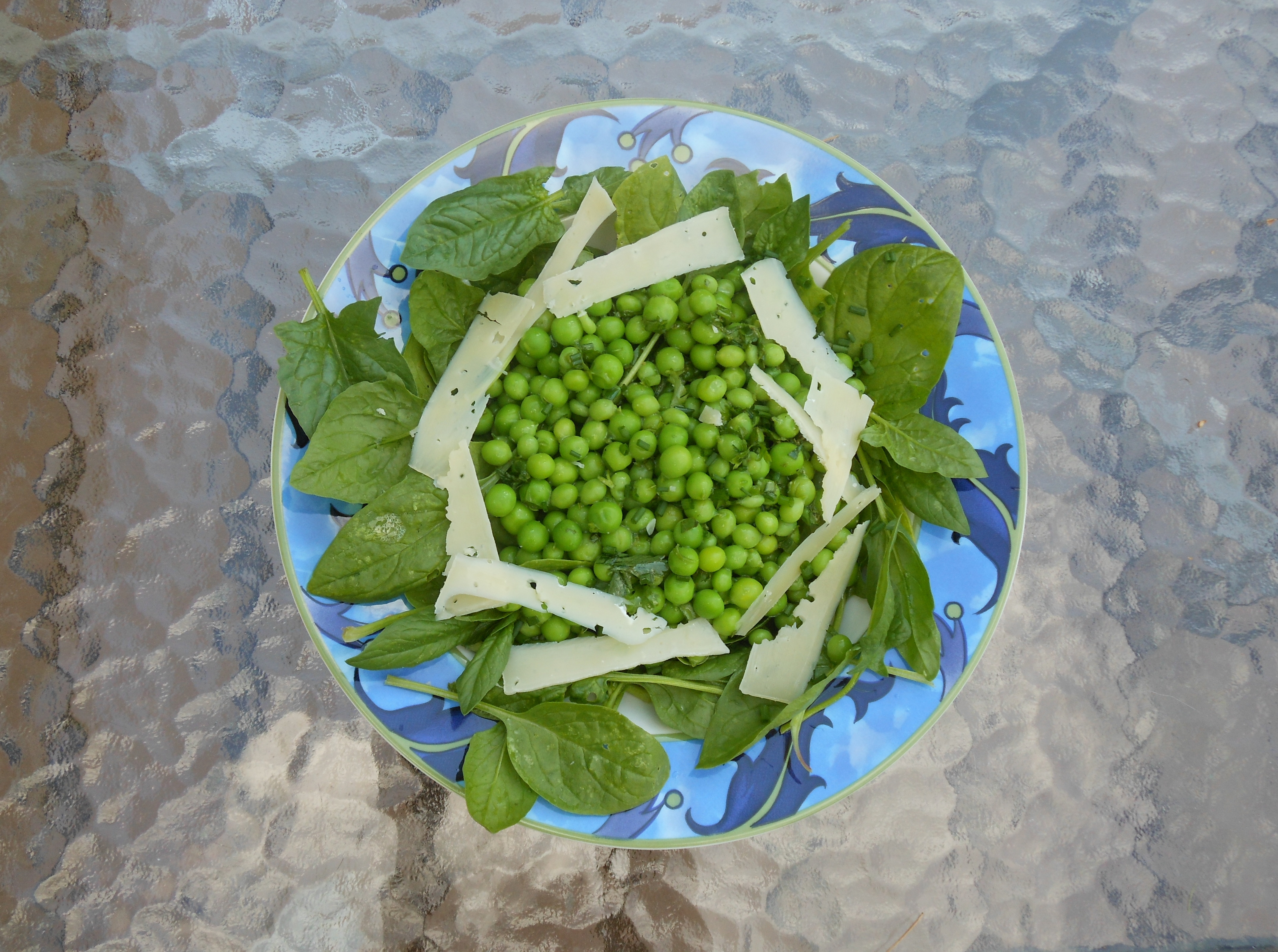 When you can get these little gems, let other flavors take a back seat. I combined them with delicate baby spinach and a light drizzle of lemon dressing. Fresh mint is the perfect foil for the sweet peas. A few shavings of parmesan are a salty finish.