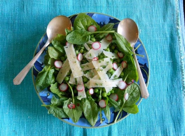 Place the spinach on a platter. Stir half the dressing into the peas, then spoon the peas in a mound on the spinach. Use the vegetable peeler to shave the parmesan into shards on top of the salad. Add the radish slices if using. Serve the extra dressing on the side.