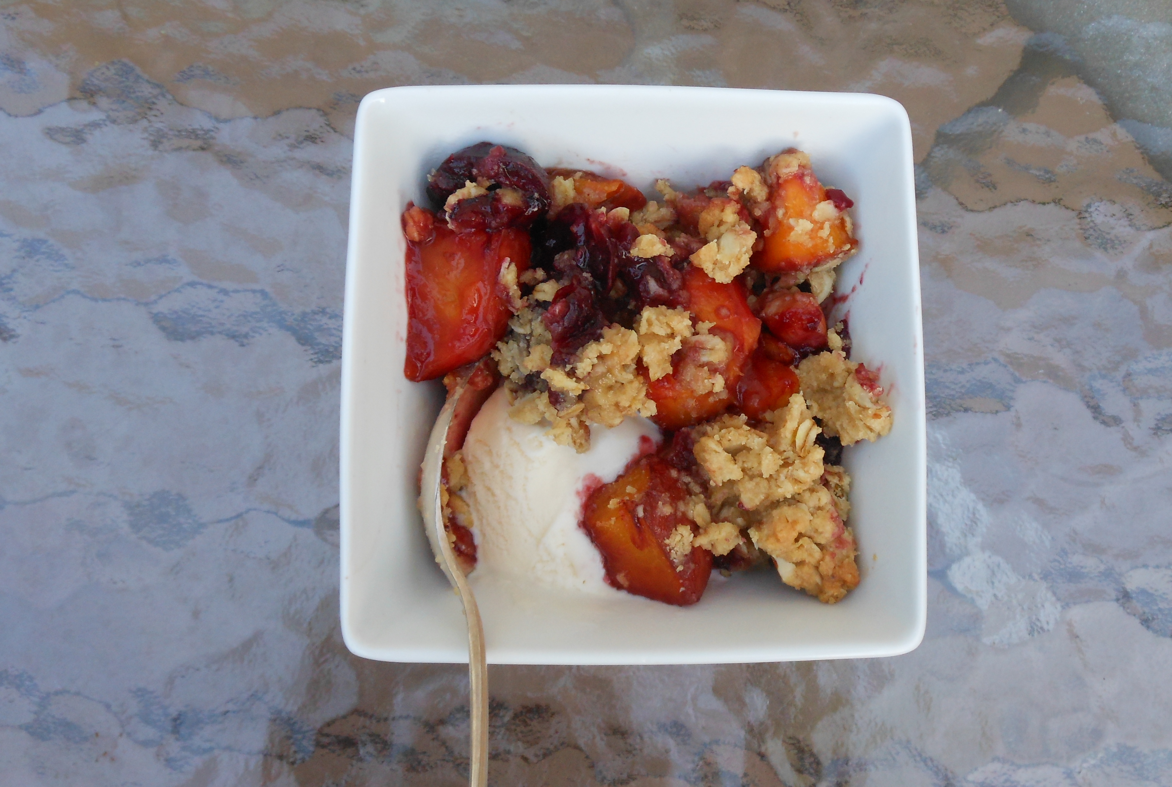 In a small bowl, mash together the topping ingredients. I use my fingers. Pour the fruit into a 10-inch pie pan or casserole. Sprinkle the topping over the fruit. Bake for 30-40 minutes until topping is golden and fruit is tender. Serve hot (with perhaps a scoop of ice cream), warm or cold. Store leftovers in the fridge.