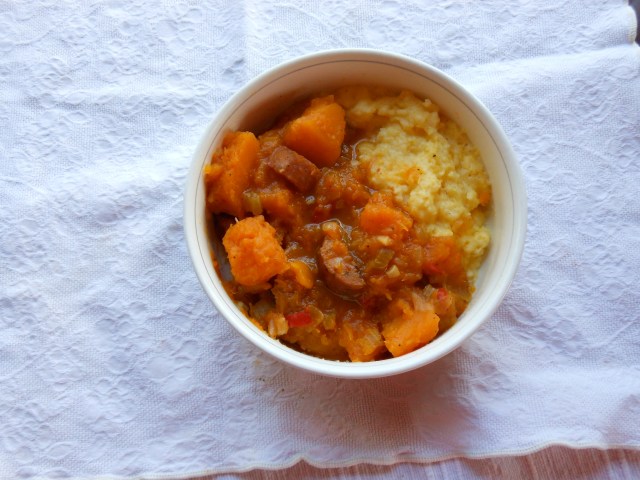 Spoon the polenta into bowls, and top with the squash and sausage.